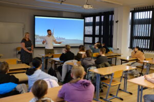 Dále žáci šli na hodinu dějepisu, kterou vedla paní učitelka Martina Šmejkalová. V této třídě žáci sledovali dva dokumenty o Sametové revoluci a Mezinárodním dni studenstva. Žáci měli možnost vidět život lidí během této doby.